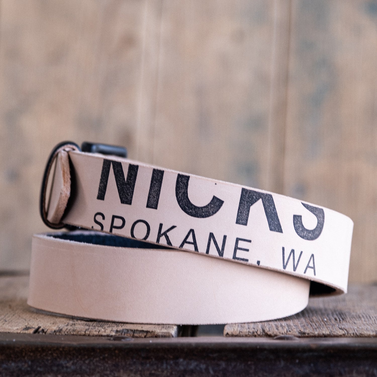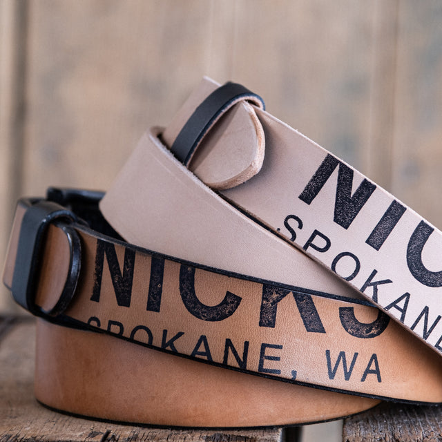 Cut from dense 12–14 oz Wickett & Craig natural veg tan leather and backed in black for sharp contrast, this belt is made to break in beautifully and tell its story over time. Instead of the standard embossed logo, the face features a large Nicks Spokane, WA ink stamp. As the leather darkens, scuffs, and picks up indigo crocking, the stamp wears in right along with it. No two will age the same.
